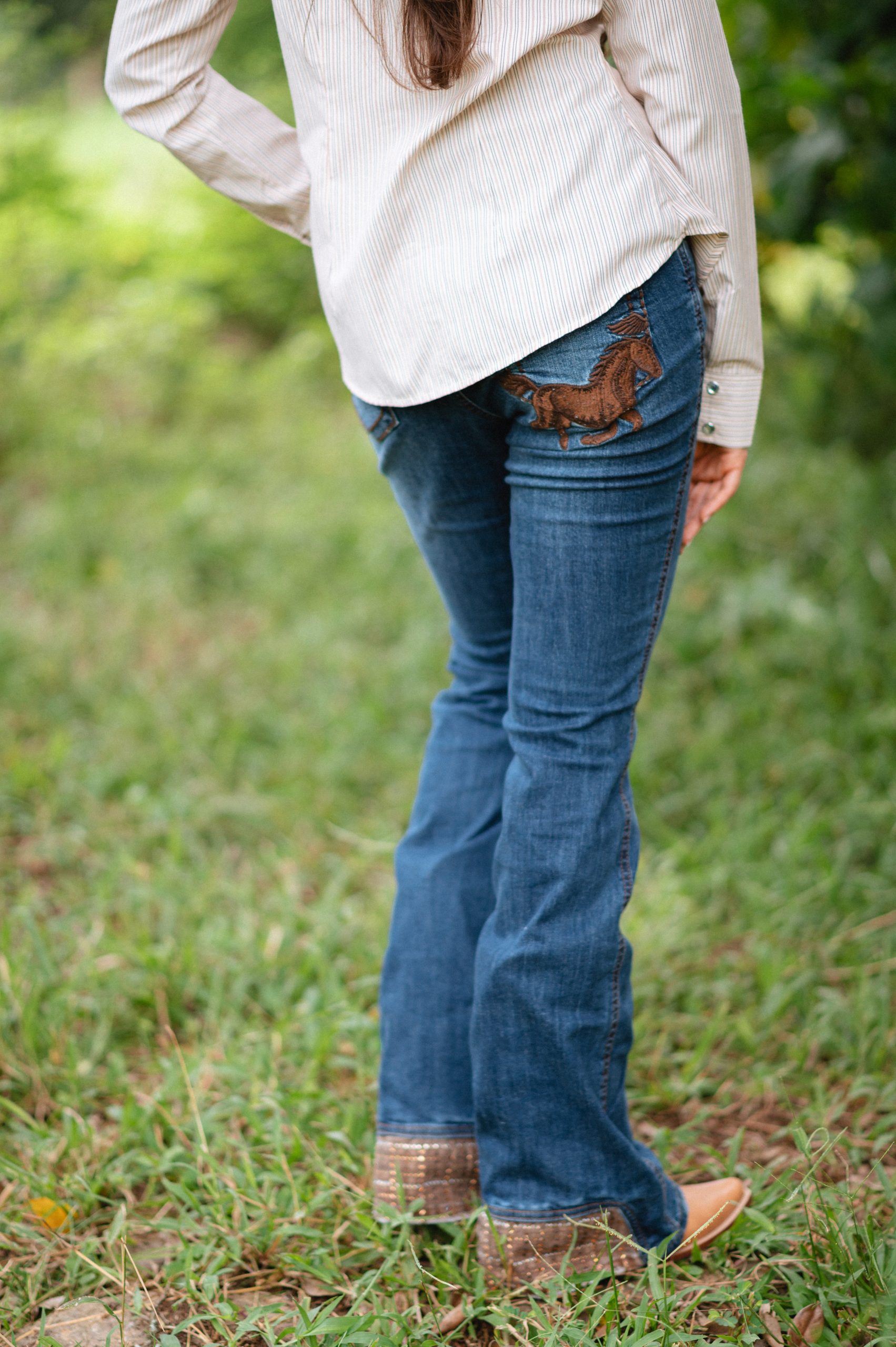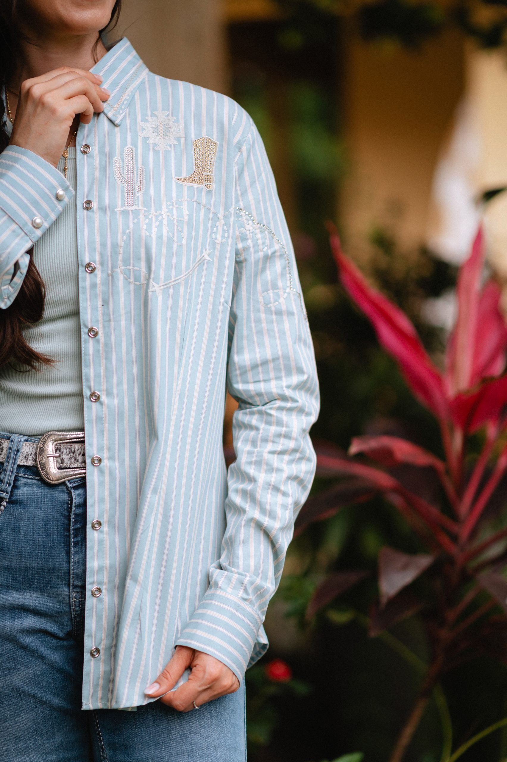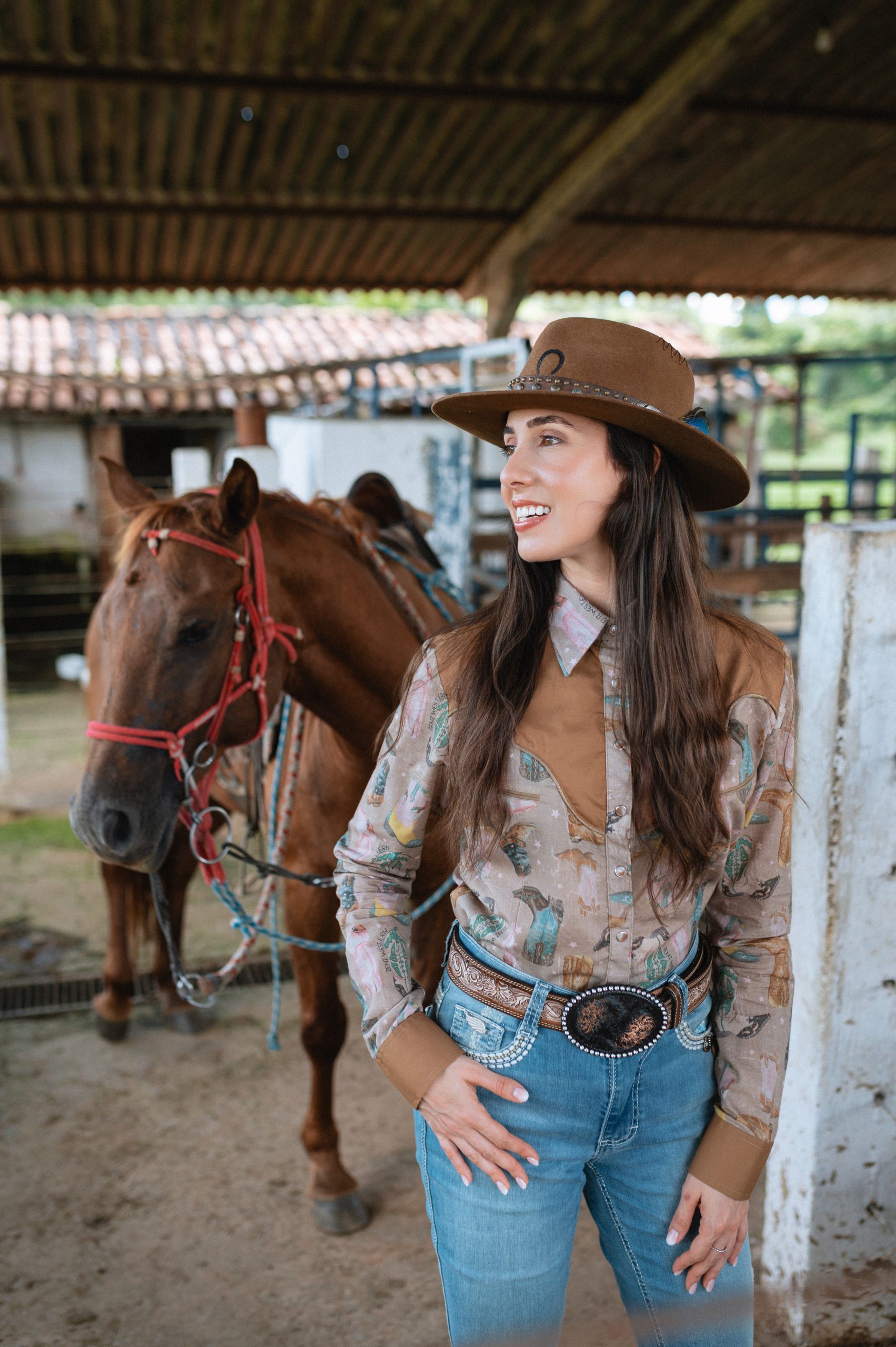 camisa feminina modelagem classica acinturada. tecido com estampa exclusiva zw, de botas coloridas e fundo bege.