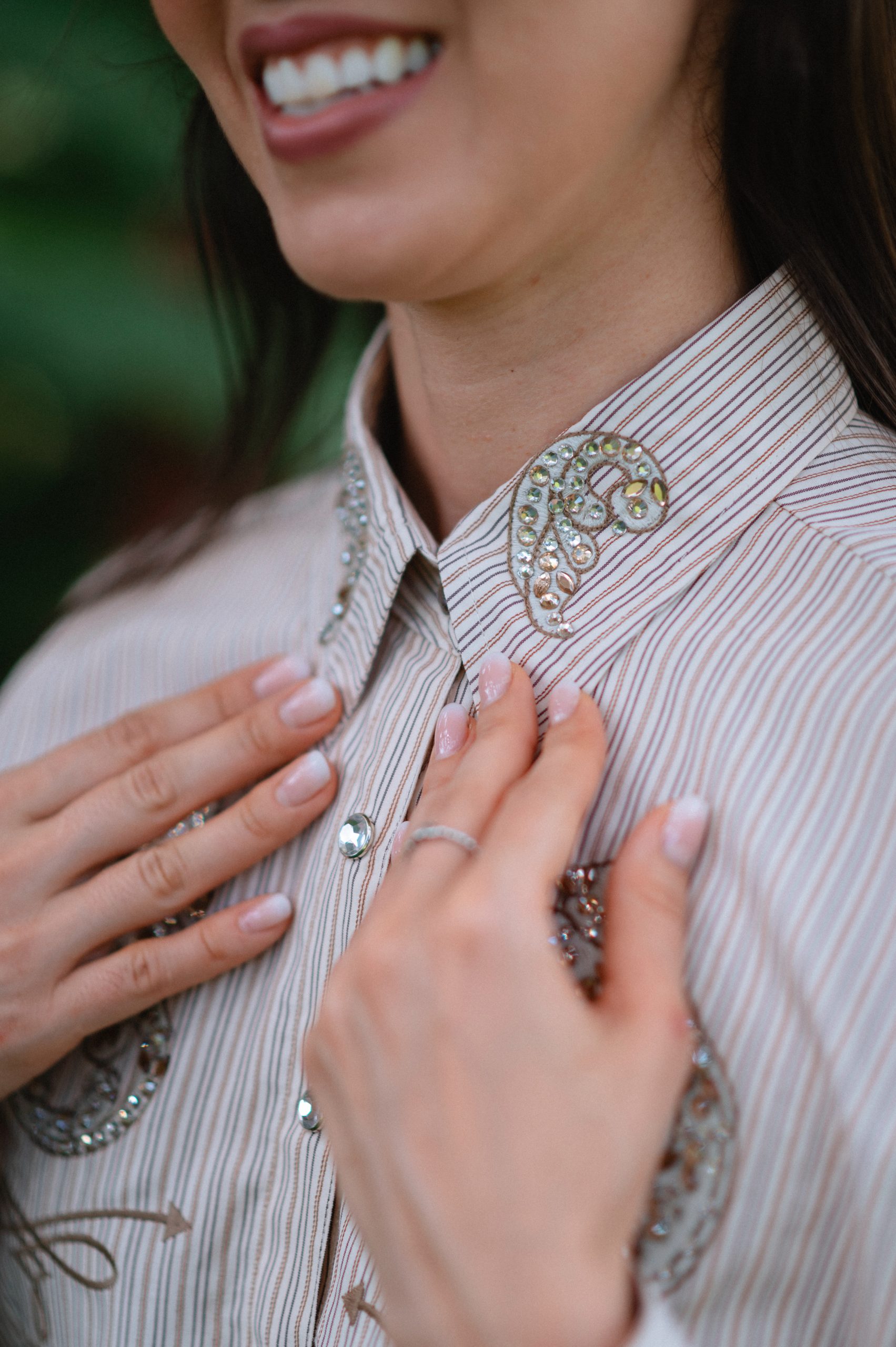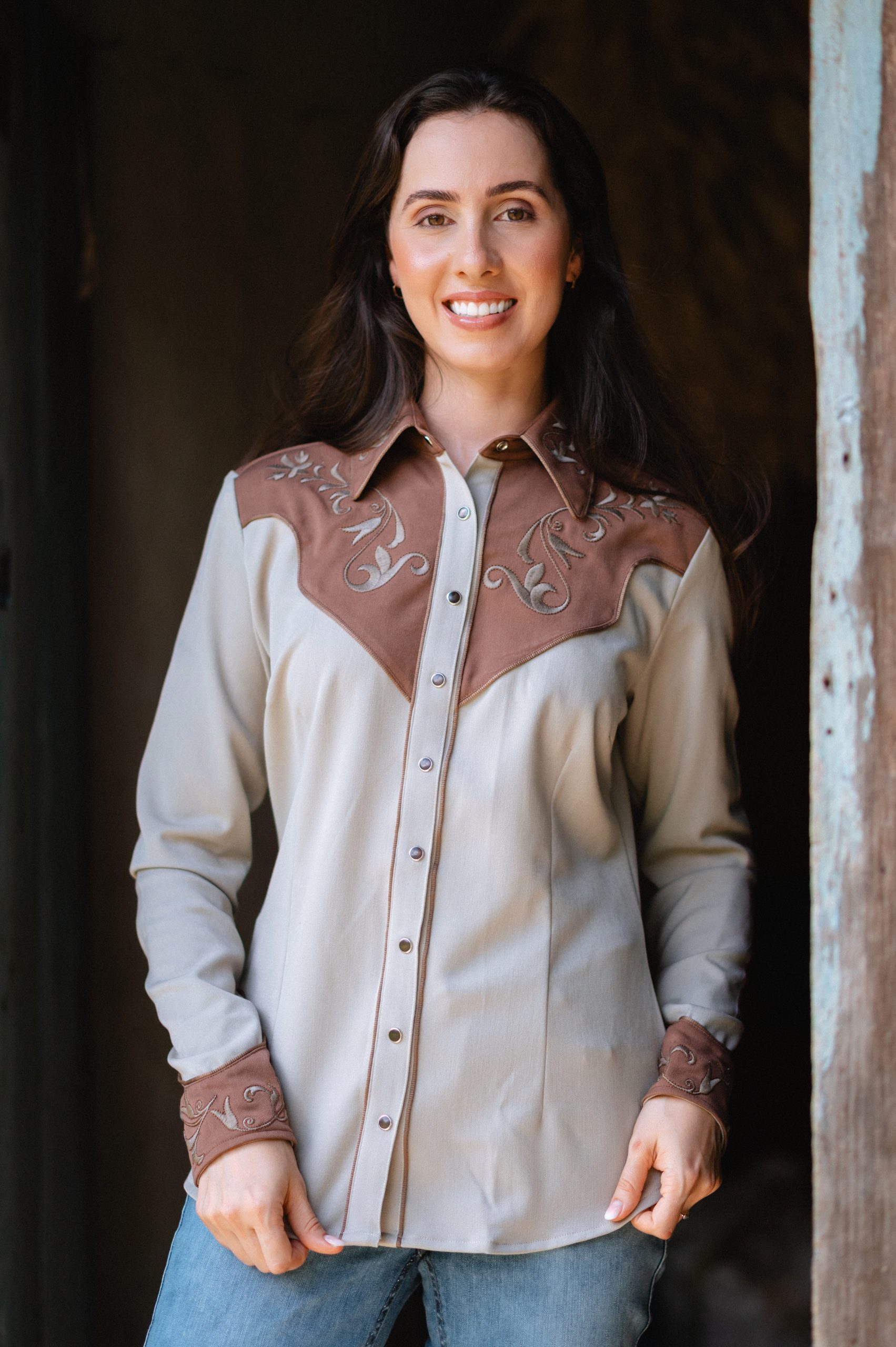 camisa feminina, modelagem acinturada, com mix de tecidos nas cores cinza claro e marrom nos detalhes de pala gola e punho.