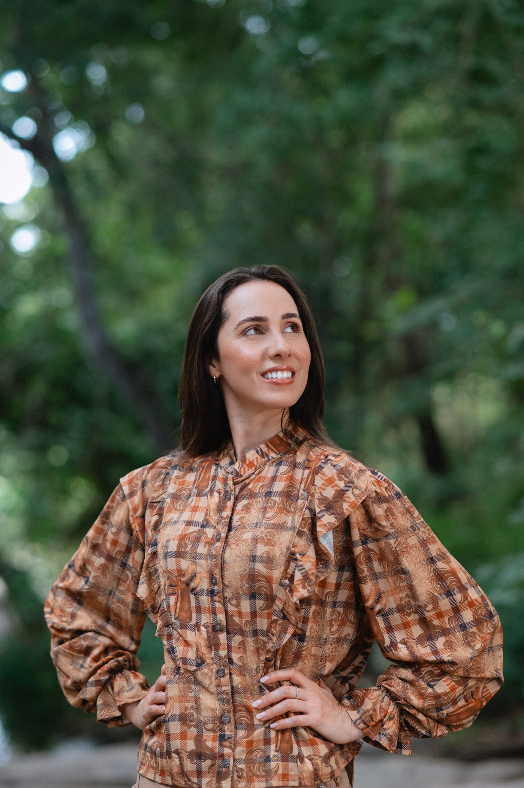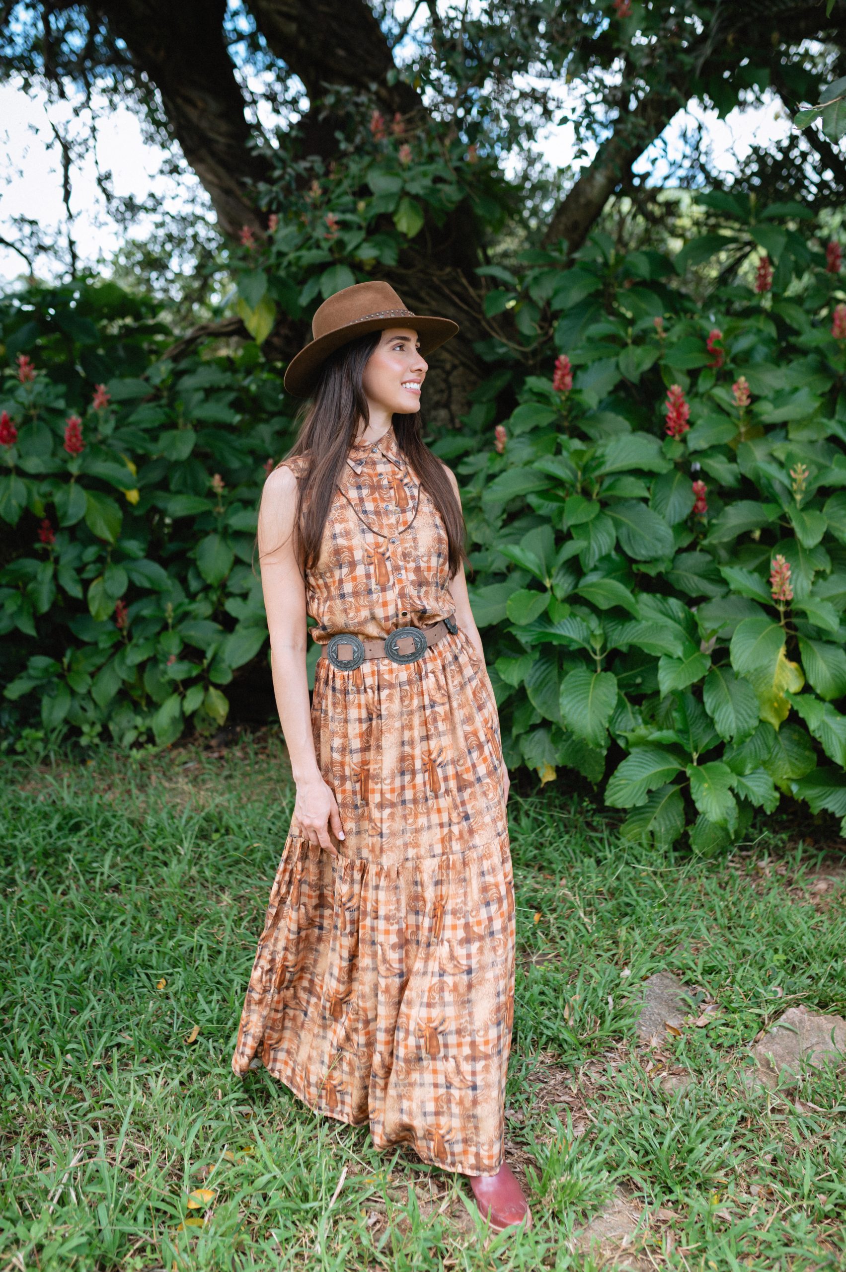 Saia longa transpassada frontal. tecido flanelado xadrez em tons terrosos.