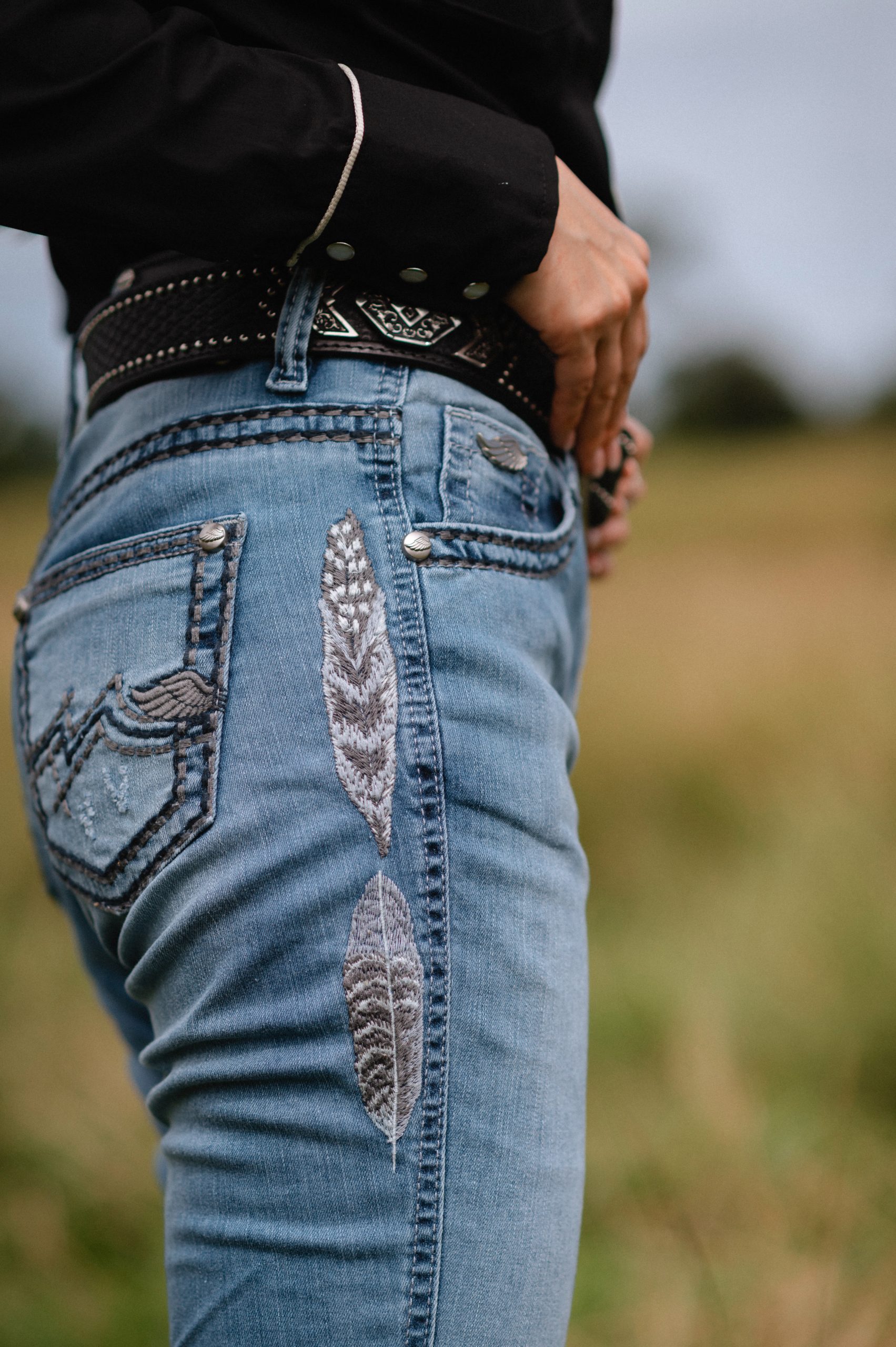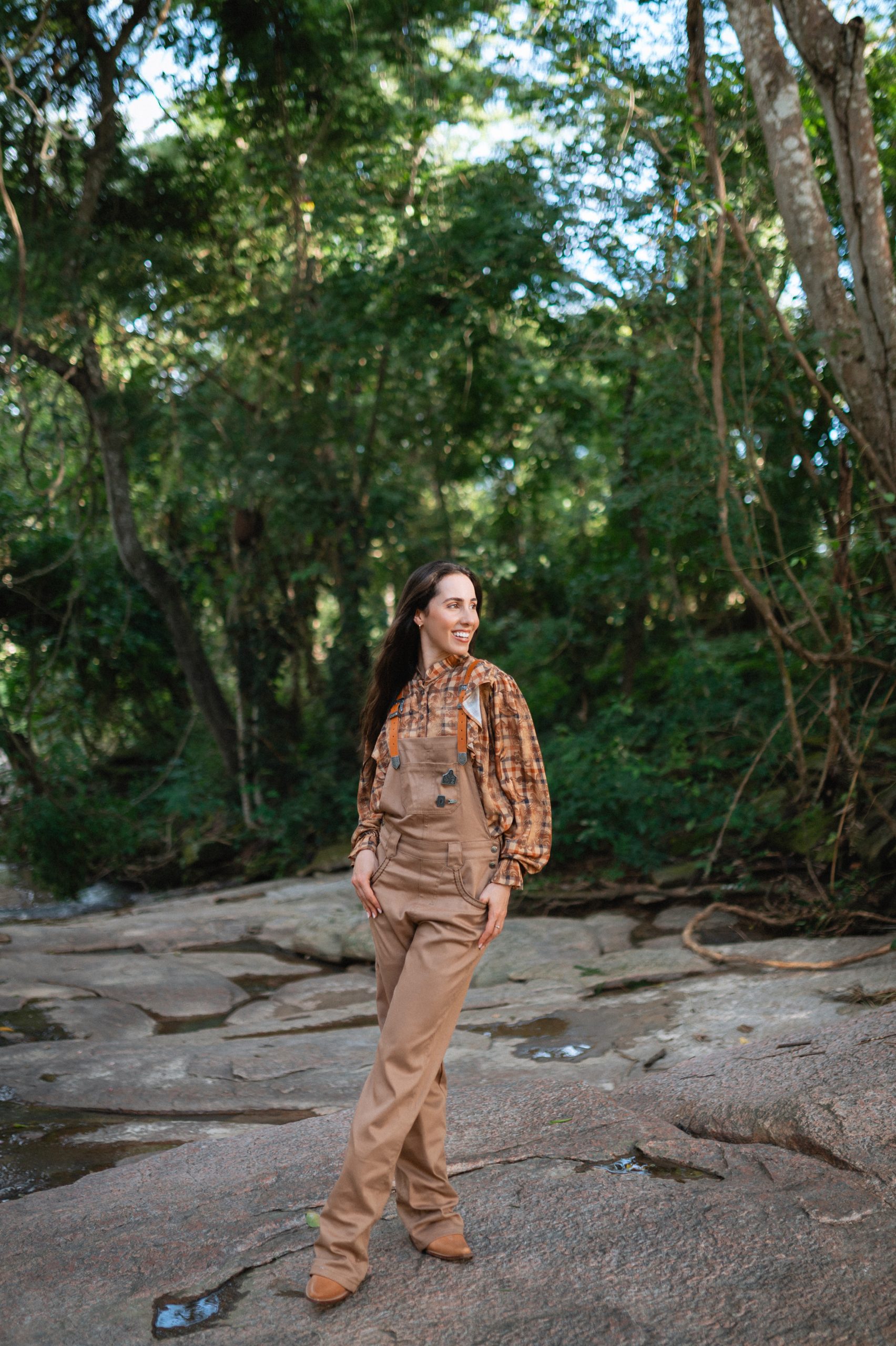 macacão longo em sarja cor marrom claro, bordados de pontos rústicos na frente e bolso traseiro na cor marrom.