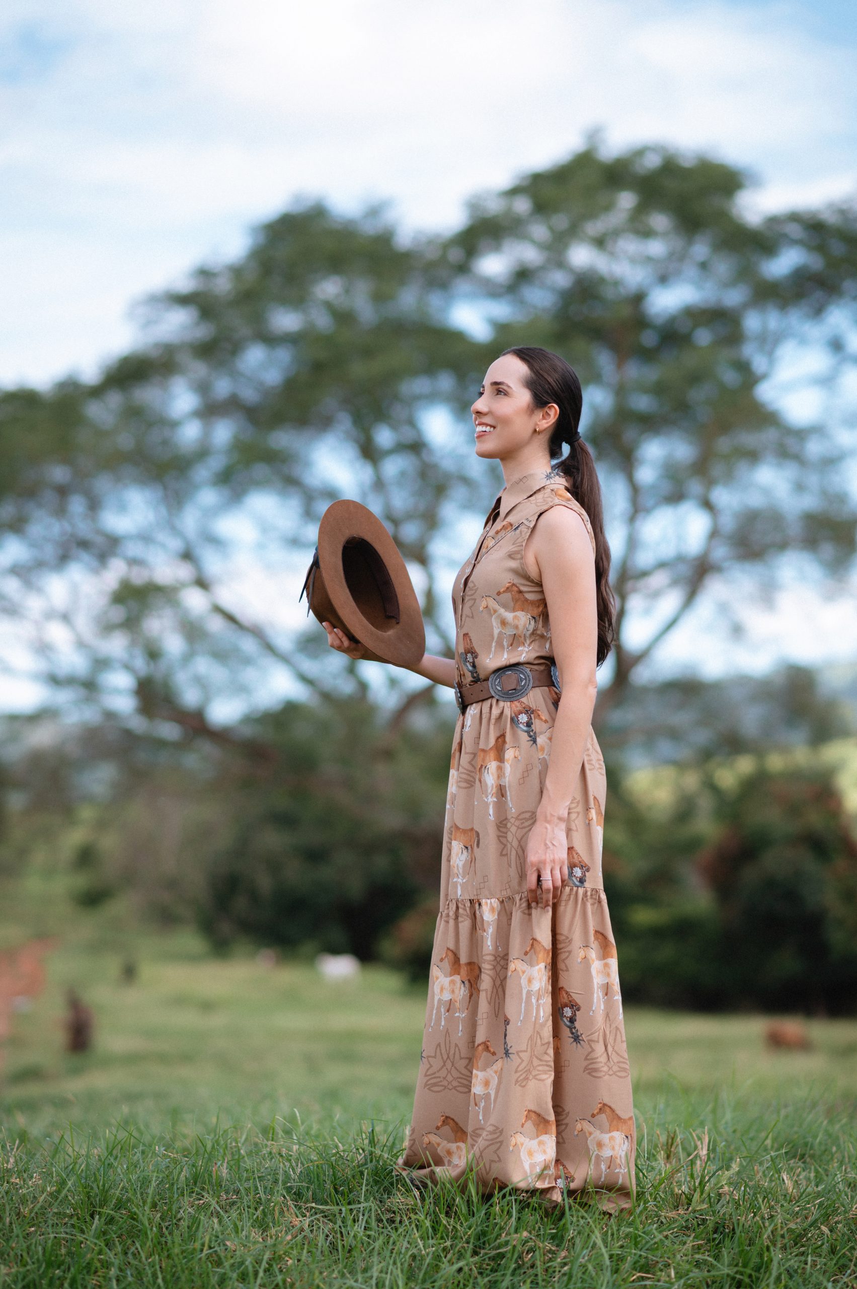 vestido longo sem mangas de gola de camisa, tecido exclusivo personalizado zenz western estampado fundo bege e motivos western com cavalinho, filigrama e espora.