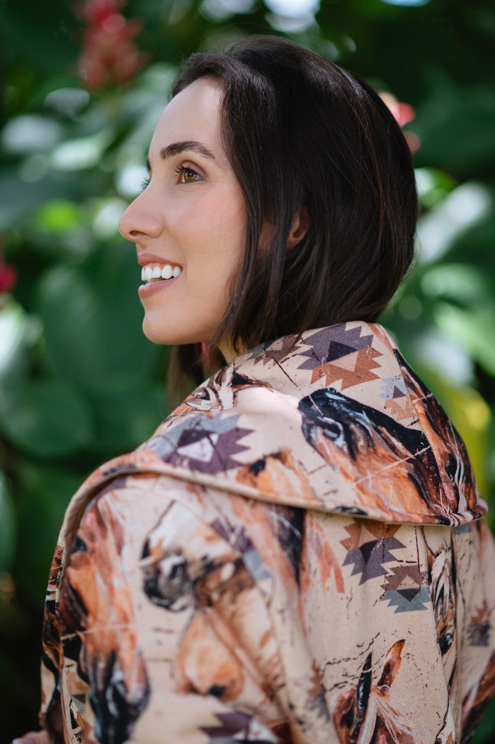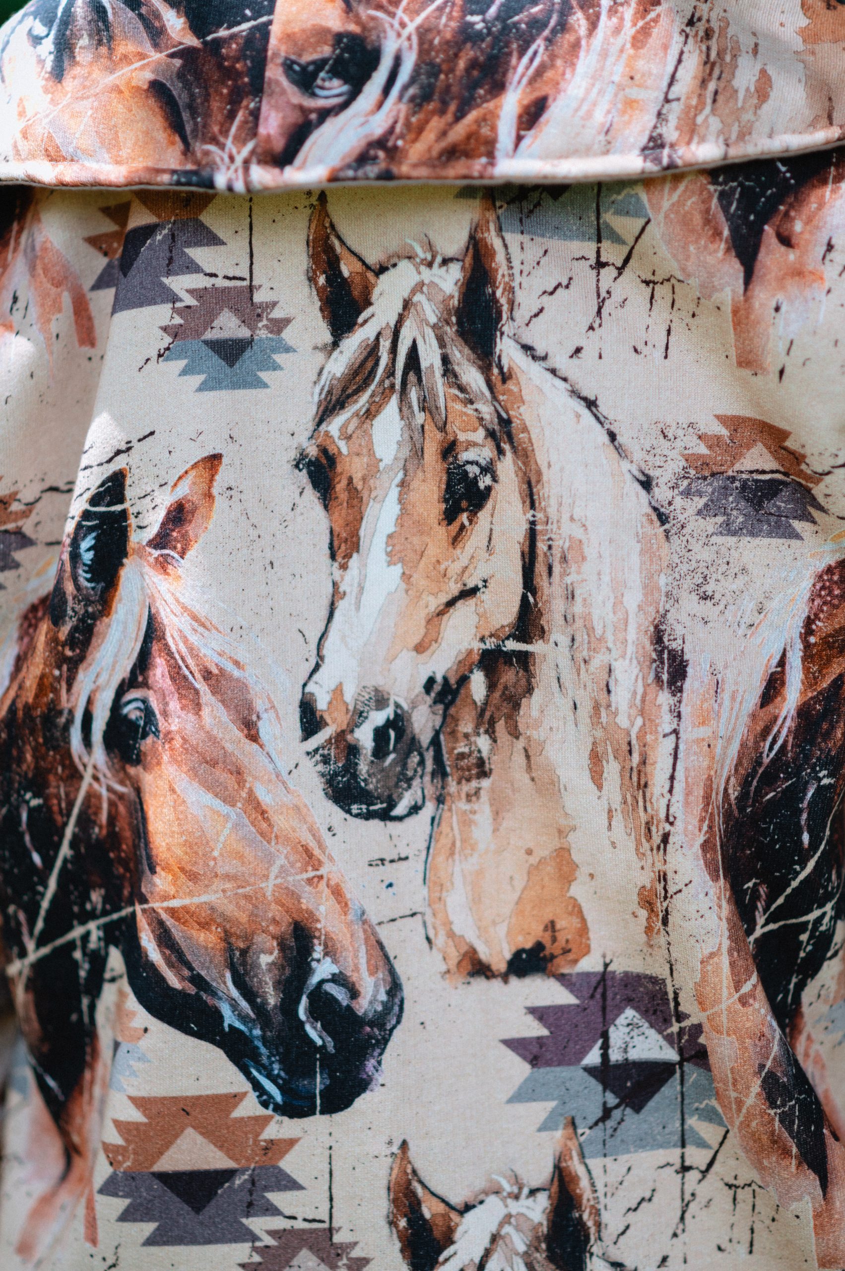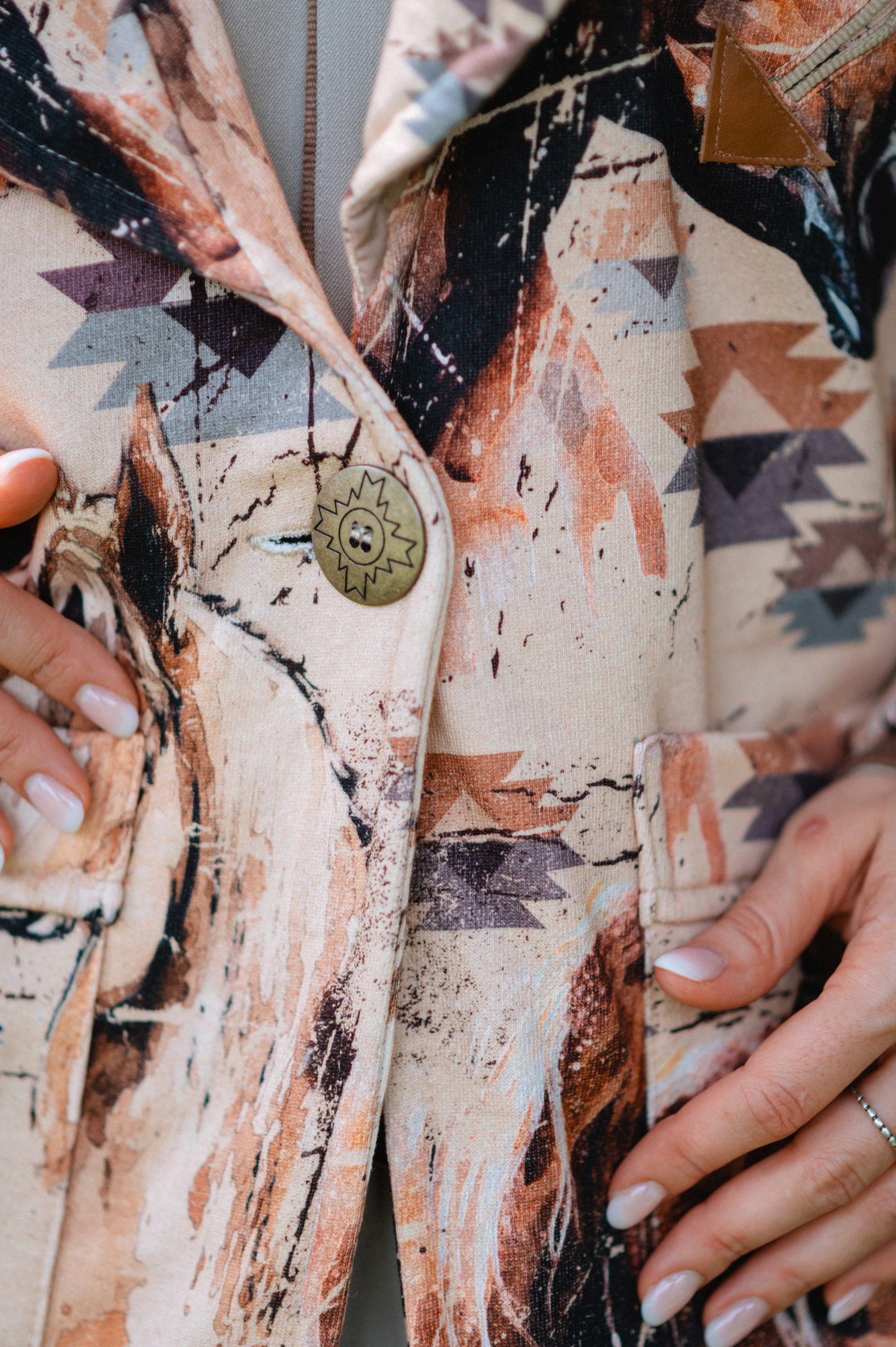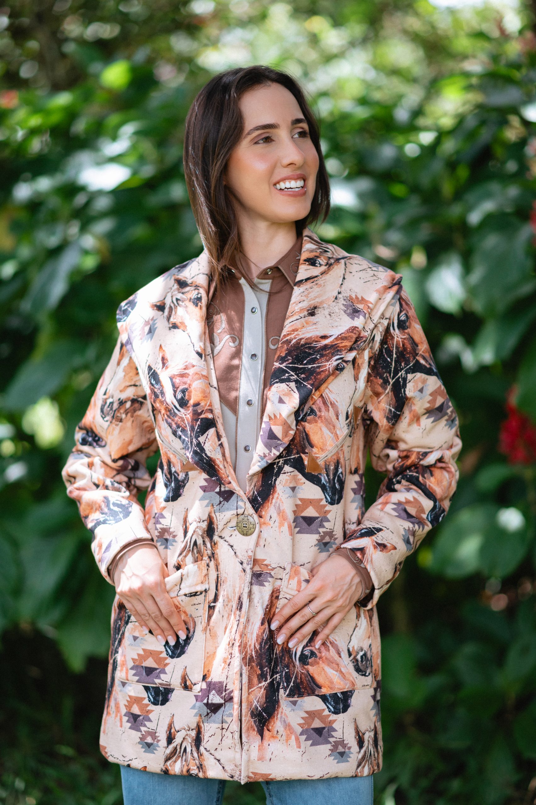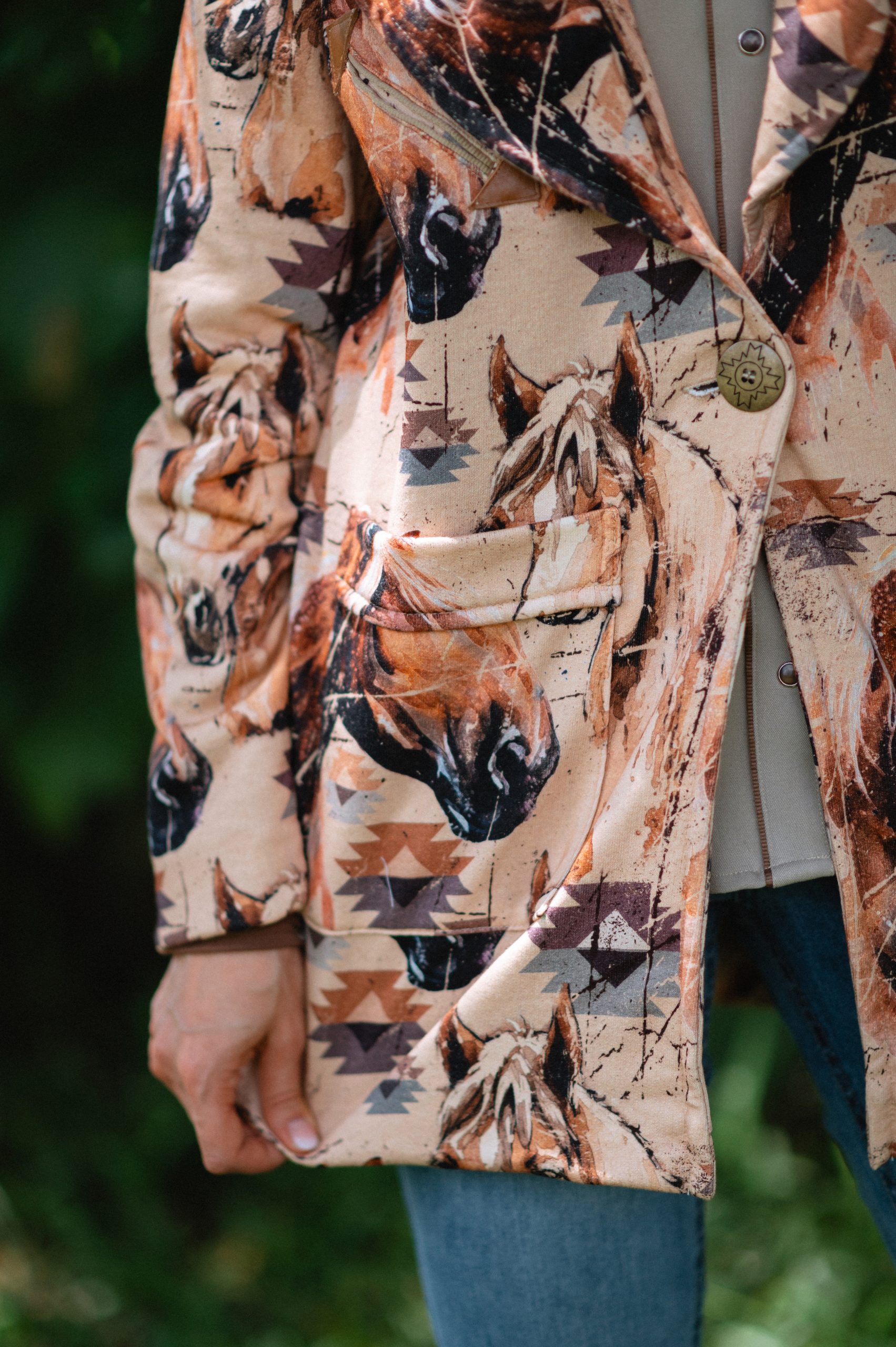 casaco feminino modelagem com transpasse frontal e gola ampla,forro interno em sobretom. comprimento alongado. tecido moletom com estampa exclusiva zenz de cavalo e motivos navajo.detalhe de bolso sorriso com com acabamento em couro. botão da frente de casear concho grande ouro velho . composição: tecido principal: 83%algodão,7%poliester tecido secundário: 65%poliester e 35% algodão.